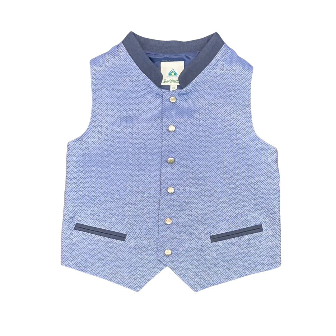 Die blaue Trachtenweste von Isar verleiht jedem Jungen-Trachtenoutfit eine elegante Note. Ob kombiniert mit Lederhose oder Trachtenhemd – sie sorgt für einen festlichen Auftritt und ist ideal für traditionelle Anlässe.